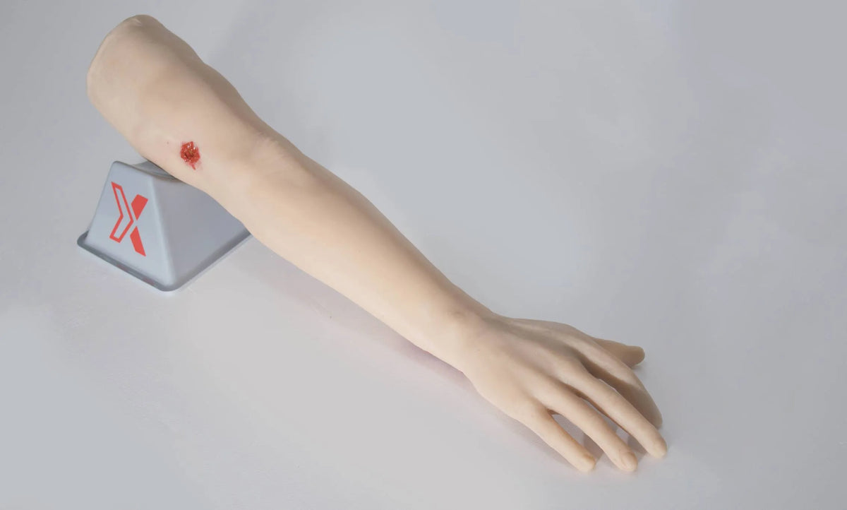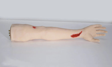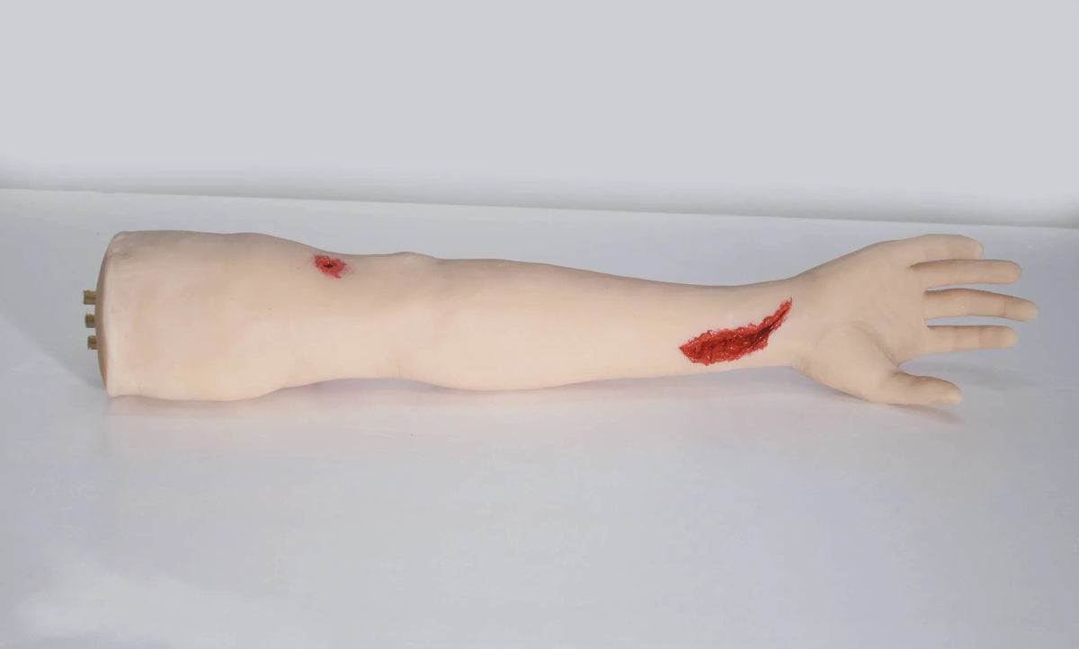 The Trauma Arm Task Trainer simulates realistic injuries like cuts and gunshot wounds for bleeding control training. It's designed for hands-on use by medical professionals and first responders.